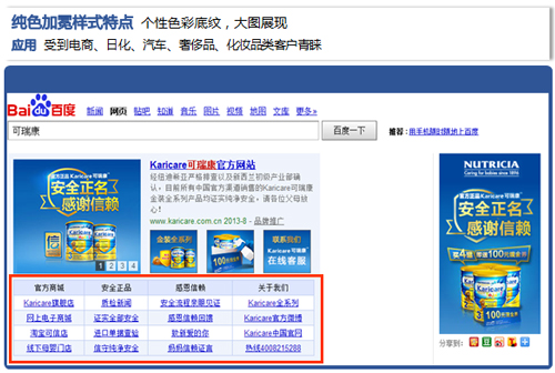 百度品牌专区,位于百度搜索结果首位,以超大黄金首屏展示位置,以文字、图片、视频等多种广告形式全方位推广展示企业品牌信息,将最为精华和直接的品牌信息展现在网民面前,众多网民也得以更便捷的了解品牌官网信息,更方便的获取所需企业资讯,是提升企业品牌推广效能的创新品牌推广模式。